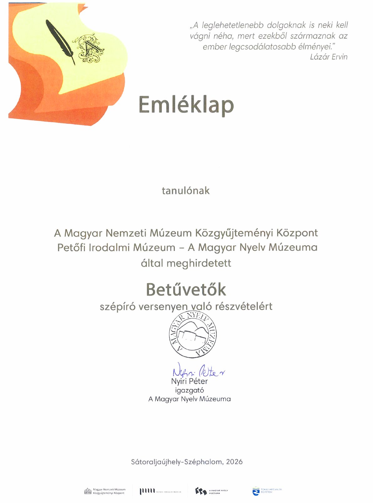 Iskolánk 10.b osztályos tanulói február végén részt vettek a Magyar Nyelv Múzeuma Sátoraljaújhely-Széphalom által kiírt Betűvető szépírás versenyen.